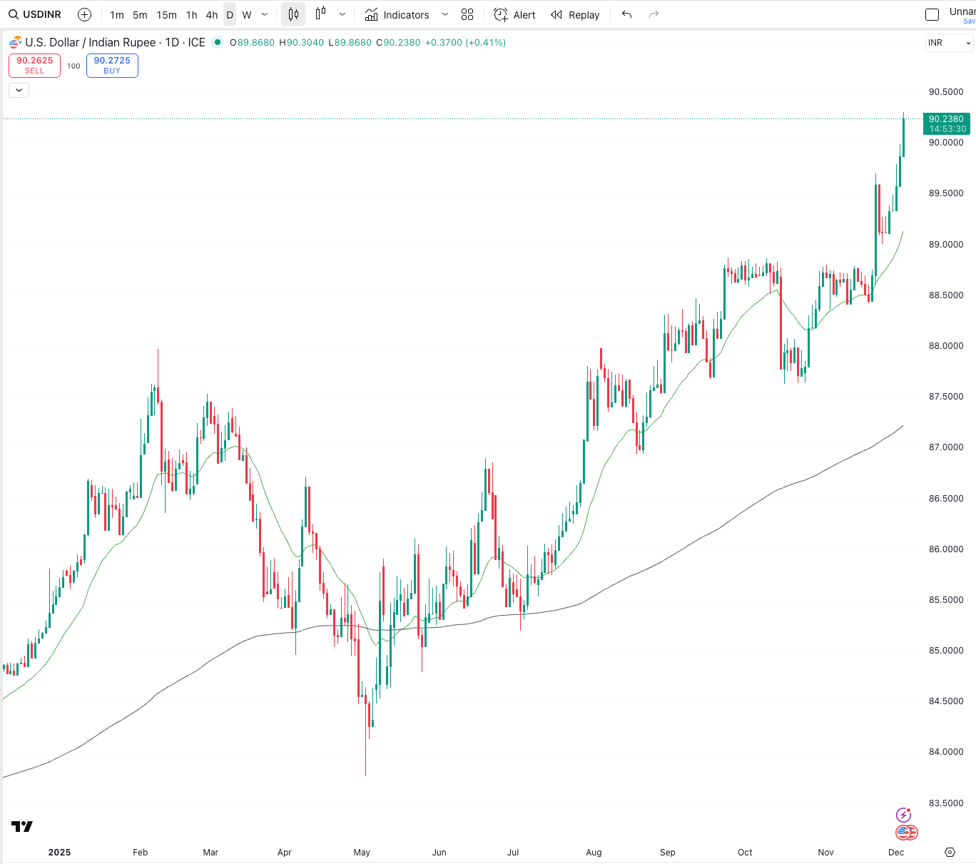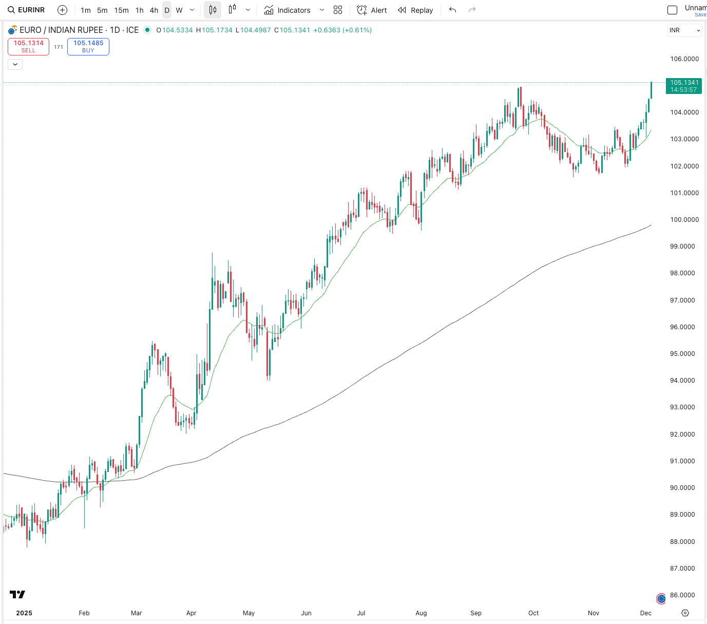 EURINR is trending the same way. Higher highs. Strong momentum. A clear upward trend.