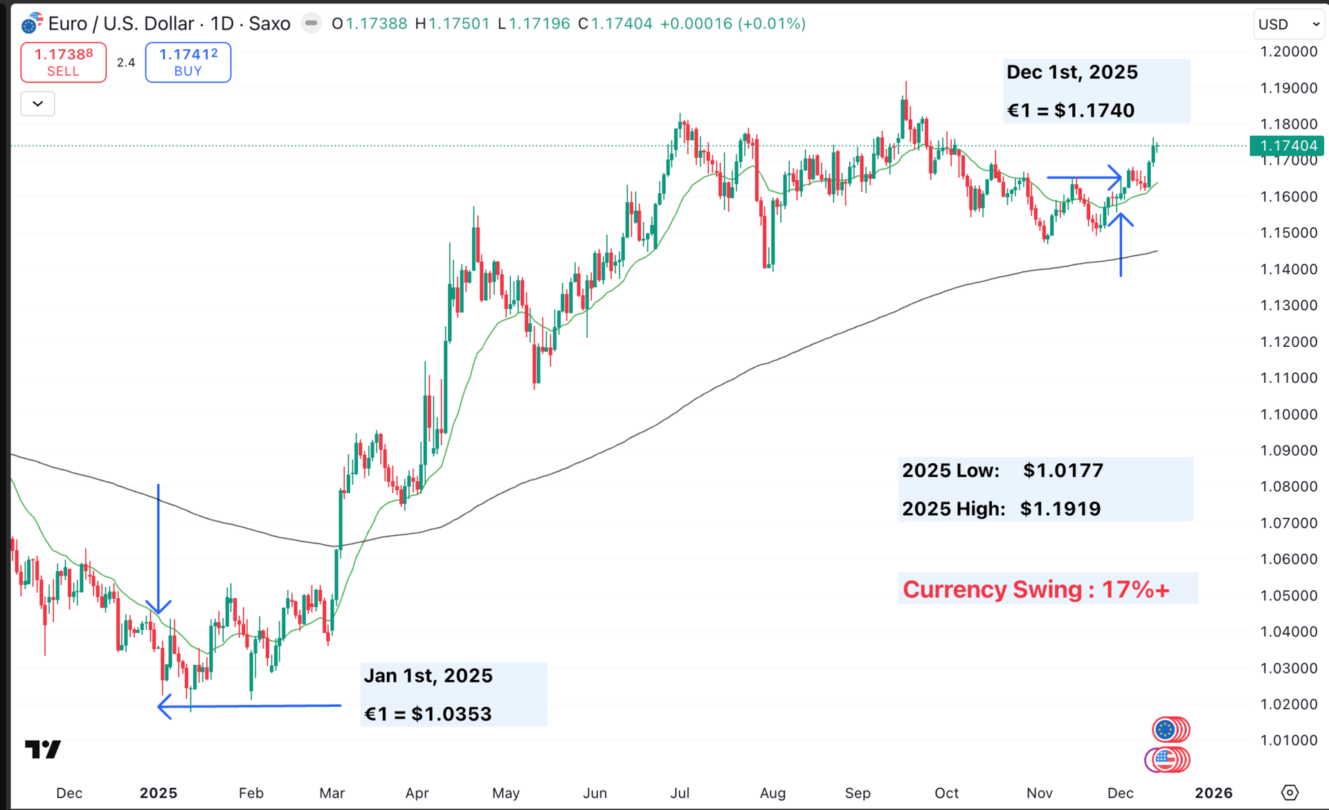 As we wrap up 2025, the euro has surged nearly 17% against the U.S. dollar since January, climbing from a low of €1 = $1.0353 to a current rate hovering around €1 = $1.1738. That's pushing it perilously close to the year's peak of $1.1919, offering a stark visual of currency volatility and opportunity.