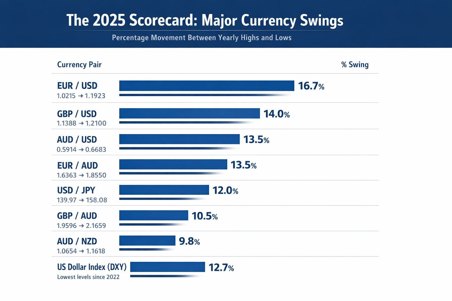 In 2025, major currency pairs moved between 10% and 17% from high to low. EUR/USD, GBP/USD, AUD/USD and even the US Dollar Index itself all experienced double-digit swings. That level of volatility is no longer unusual. It is becoming the norm.
